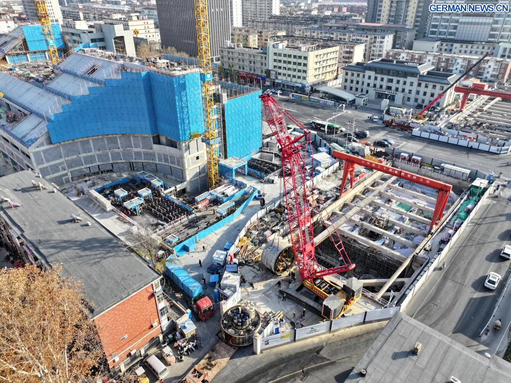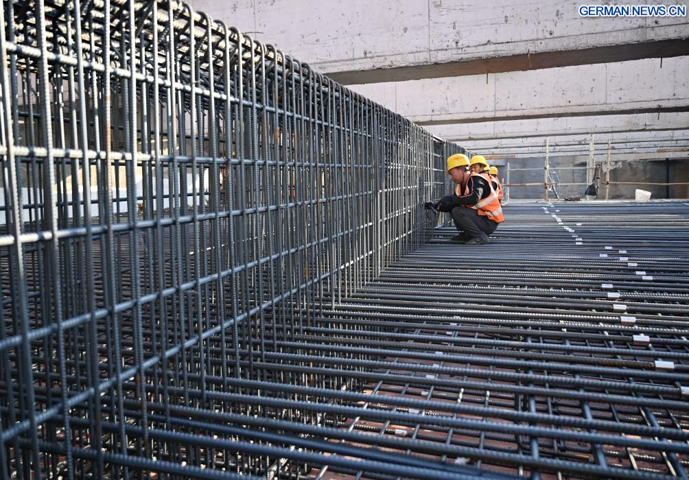 SHIJIAZHUANG, 8. Dezember (Xinhuanet) -- Arbeiter binden Stahlstangen auf einer Baustelle der U-Bahn-Linie 5 in Shijiazhuang in der nordchinesischen Provinz Hebei, 9. Dezember 2025. Der Bau der U-Bahn-Linie 5 in Shijiazhuang schreitet stetig voran, mehrere Abschnitte wurden bereits in zwei Richtungen durchbohrt. (Quelle: Xinhua/Mu Yu)