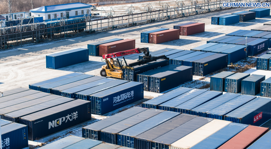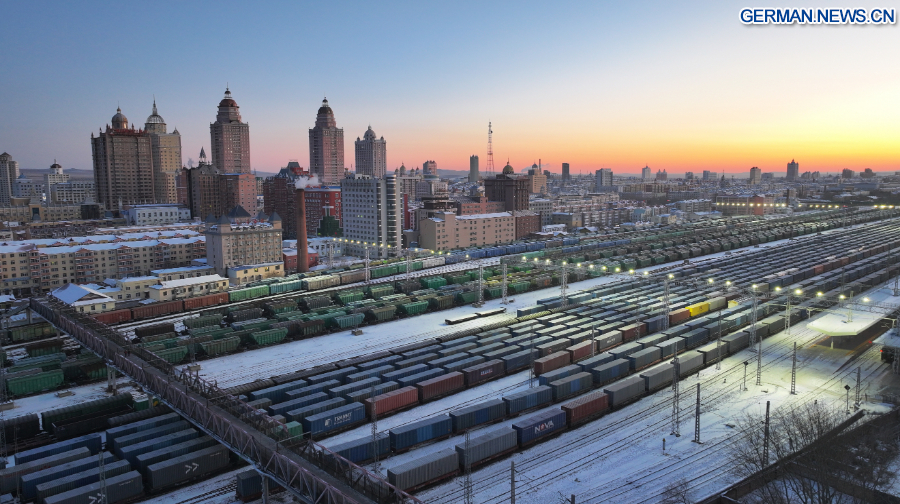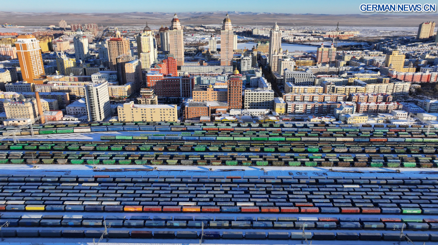 Der „östliche Korridor” besteht aus drei Eisenbahn-Grenzübergängen, darunter Manzhouli, Suifenhe und Tongjiang. Derzeit sind die Kategorien der von den Zügen transportierten Güter auf mehr als 1.000 Warenarten angestiegen. Die Anzahl der betriebenen Strecken hat sich auf 27 erweitert und verbindet mehr als 60 chinesische Städte mit 14 europäischen Ländern. (Foto von Huang Xu/Xinhua)