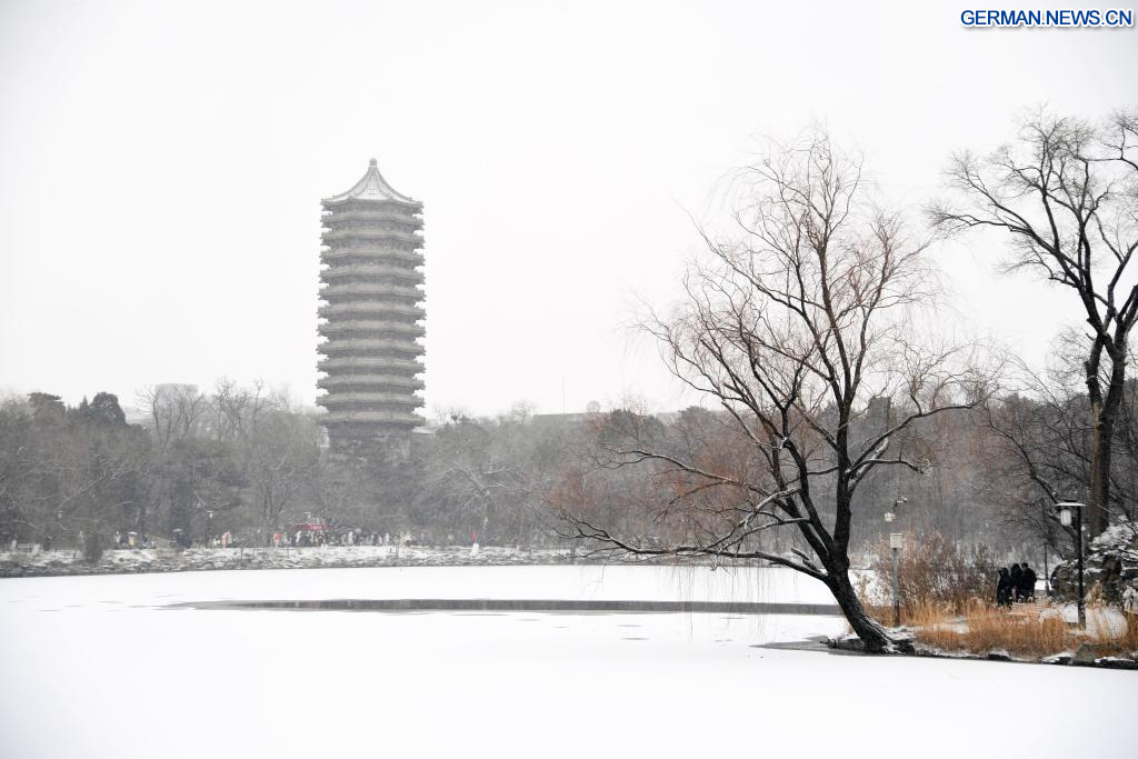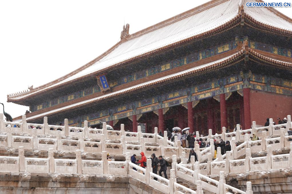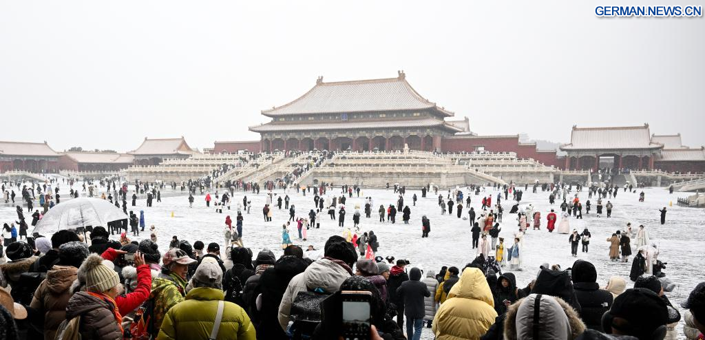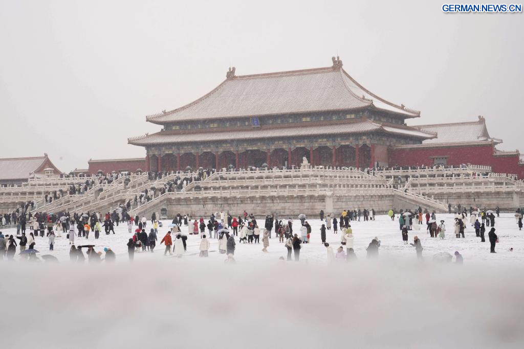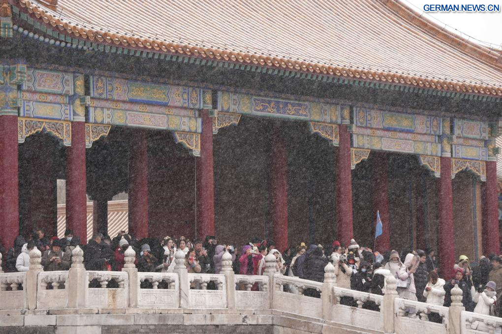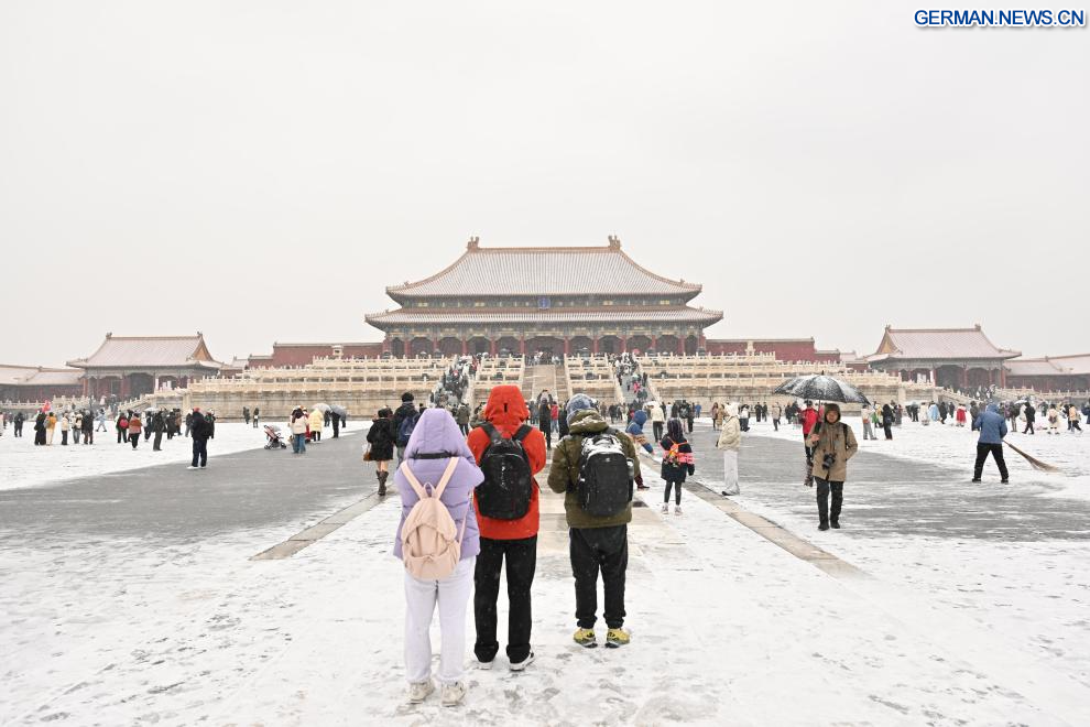 BEIJING, 12. Dezember 2025 (Xinhuanet) -- Touristen besuchen das Palastmuseum bei Schneefall in Chinas Hauptstadt Beijing, 12. Dezember 2025. Beijing erlebte am Freitag den ersten bedeutenden Schneefall dieser Wintersaison. (Quelle: Xinhua/Yin Dongxun)