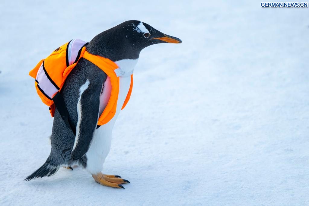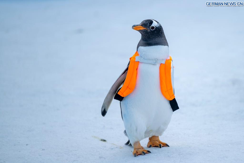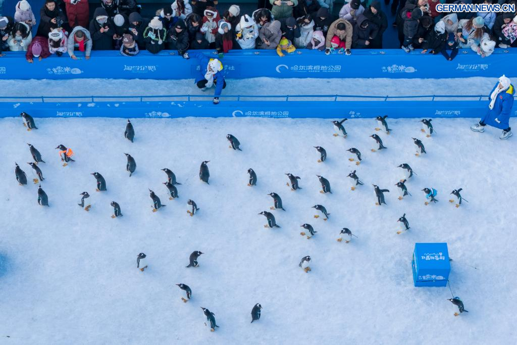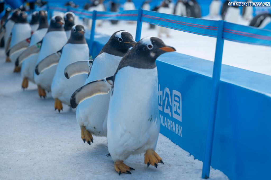 HARBIN, 13. Dezember 2025 (Xinhuanet) -- Pinguine sind während einer Pinguinparade im Harbin Polarland in Harbin, der Hauptstadt der nordostchinesischen Provinz Heilongjiang, zu sehen, 13. Dezember 2025. Das Harbin Polarland veranstaltete am Samstag eine Pinguinparade mit 100 antarktischen Pinguinen. (Quelle: Xinhua/Zhang Tao)