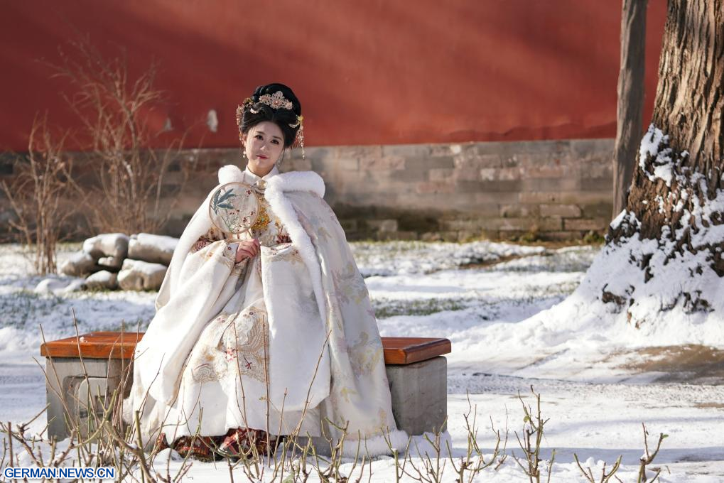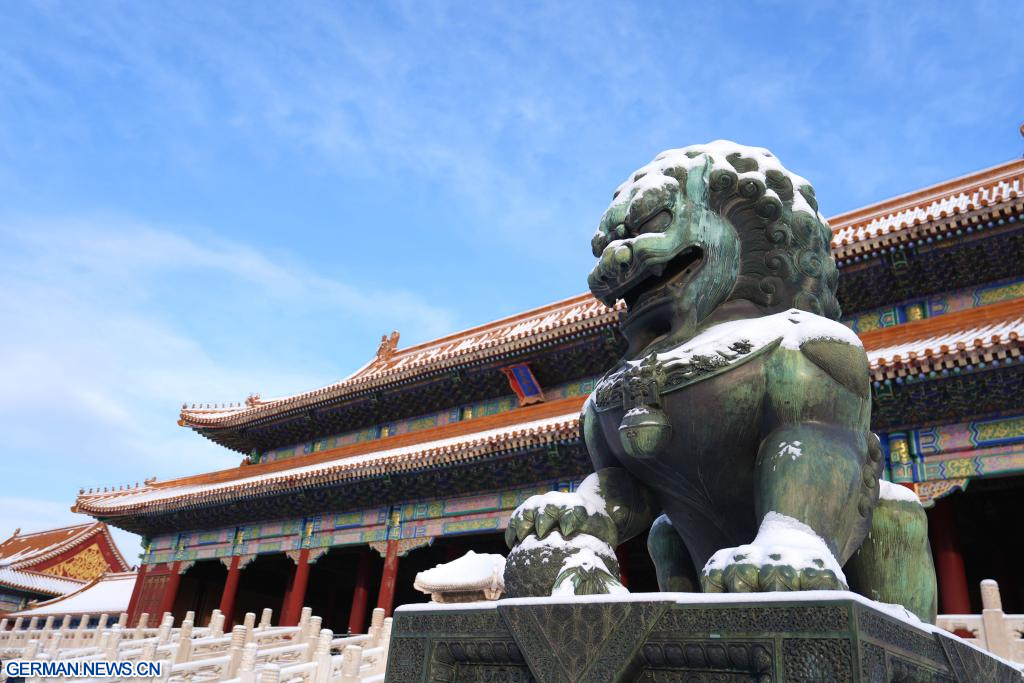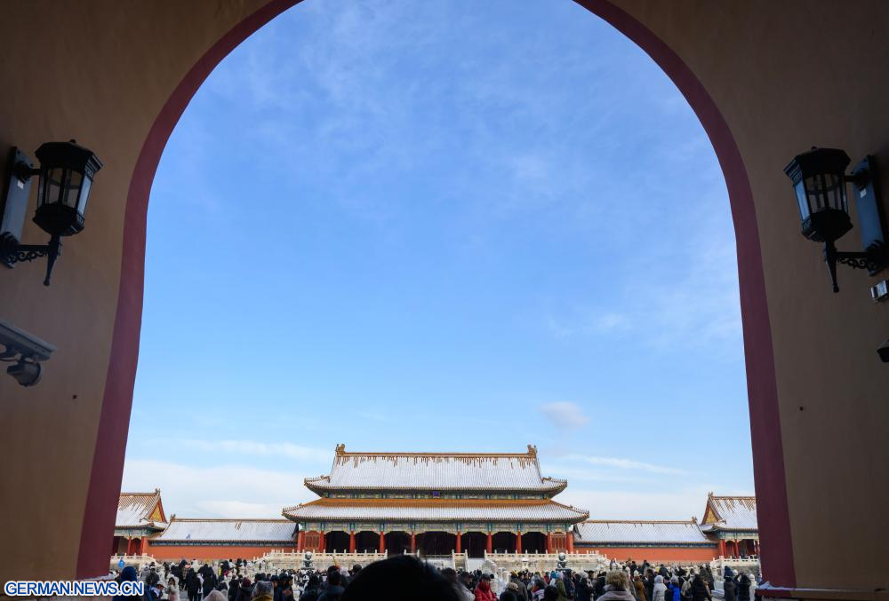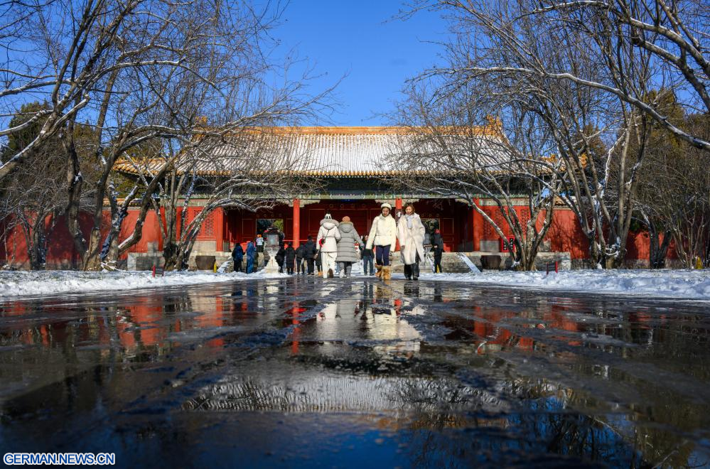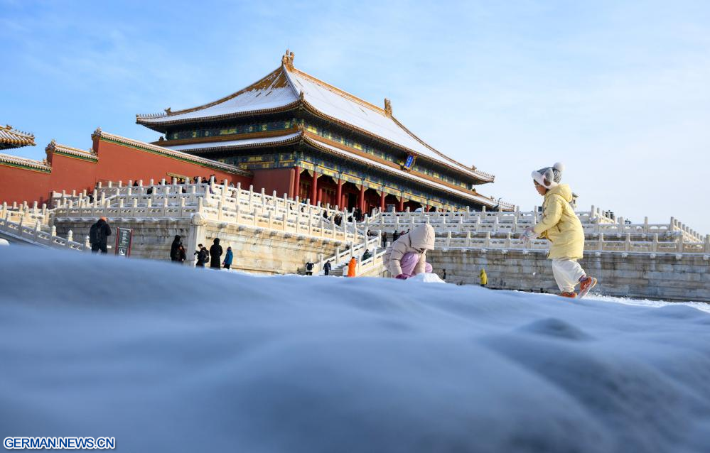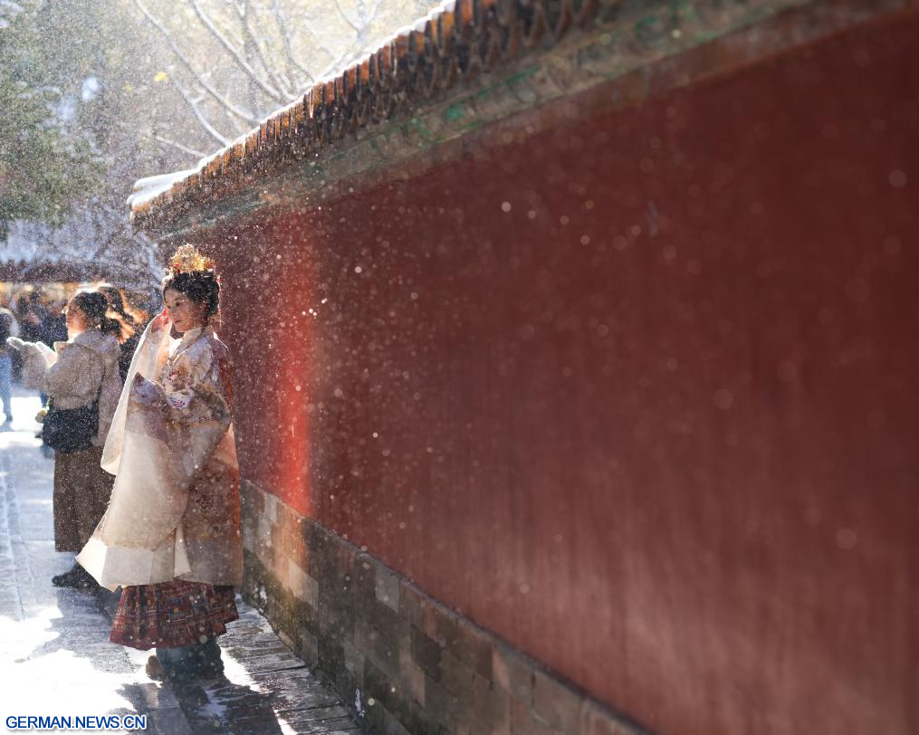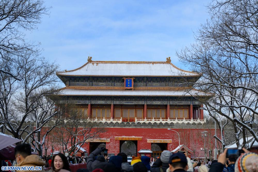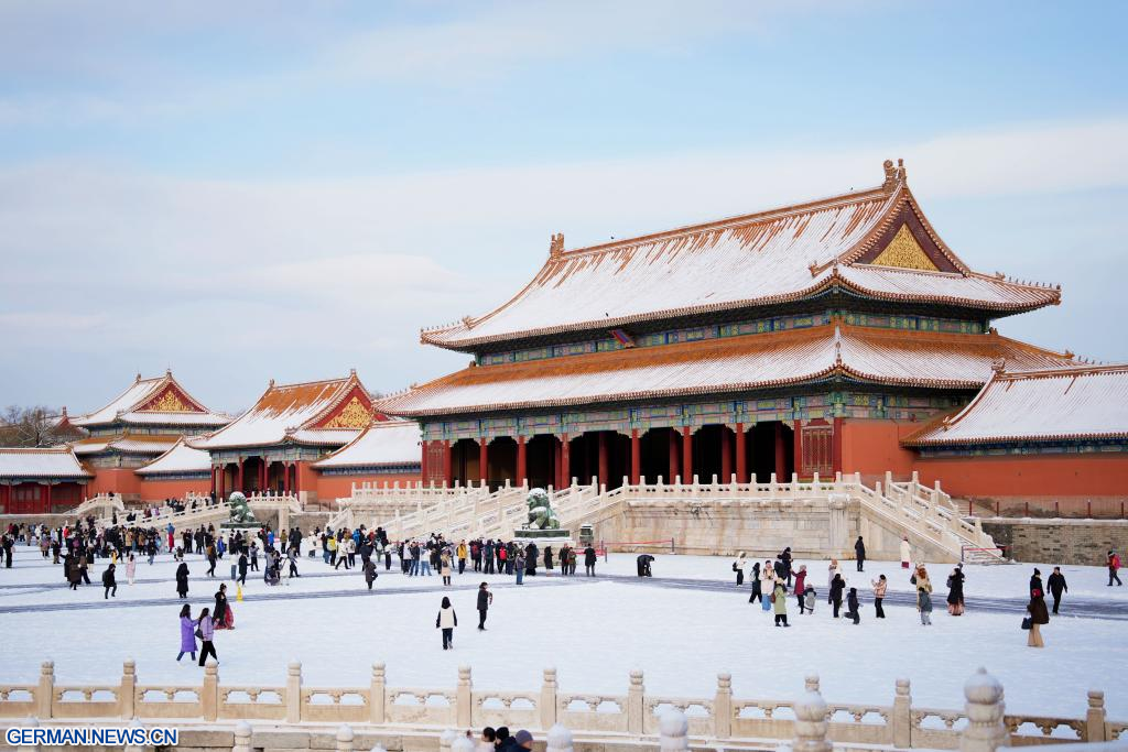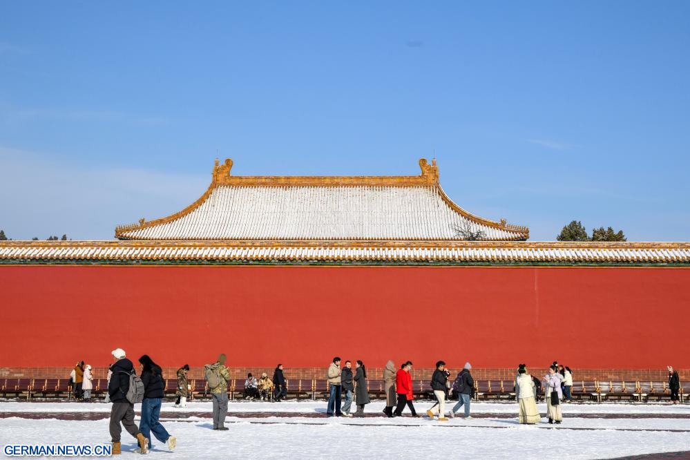 BEIJING, 13. Dezember 2025 (Xinhuanet) -- Touristen besuchen das Palastmuseum nach Schneefall in der chinesischen Hauptstadt Beijing, 13. Dezember 2025. (Quelle: Xinhua/Ma Xiaodong)