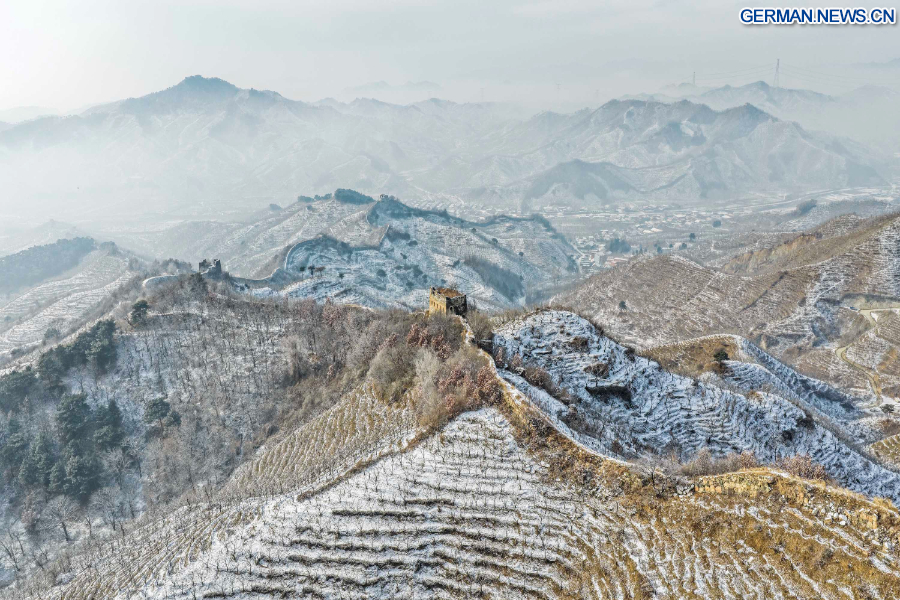 BEIJING, 14. Dezember 2025 (Xinhua) -- Die Luftaufnahme einer Drohne zeigt die verschneite Landschaft an einem Abschnitt der Großen Mauer in der nordchinesischen Provinz Hebei, 13. Dezember 2025. (Foto: Liu Mancang/Xinhua)